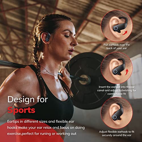 ♫【Engineered Design for Sports】: Equipped with soft, adjustable, secure-fit ear hooks for lightweight comfort and stability design, and three different sizes of ear tips for choice, totally ensuring the sports earbuds stay comfortably firm in place and won’t fall off. Reinforced IPX7 design for sweat & water resistance during tough workouts or running.